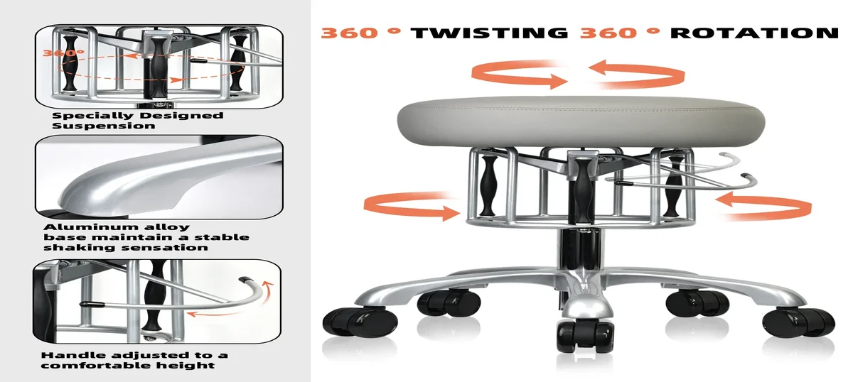 - 360-Graden Rotatie: Geniet van volledige bewegingsvrijheid met de volledige rotatiecapaciteit van de kruk, zodat u moeiteloos alle hoeken van uw werkplek kunt bereiken zonder inspanning.